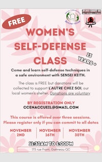 Keith Gour also offers FREE women’s self defense classes. The classes are specifically for women only and focus on basic, intermediate and advanced techniques. Classes are held on specific days and registration is required. For more info you can call or text 613-897-1082 or email karategokg03@gmail.com